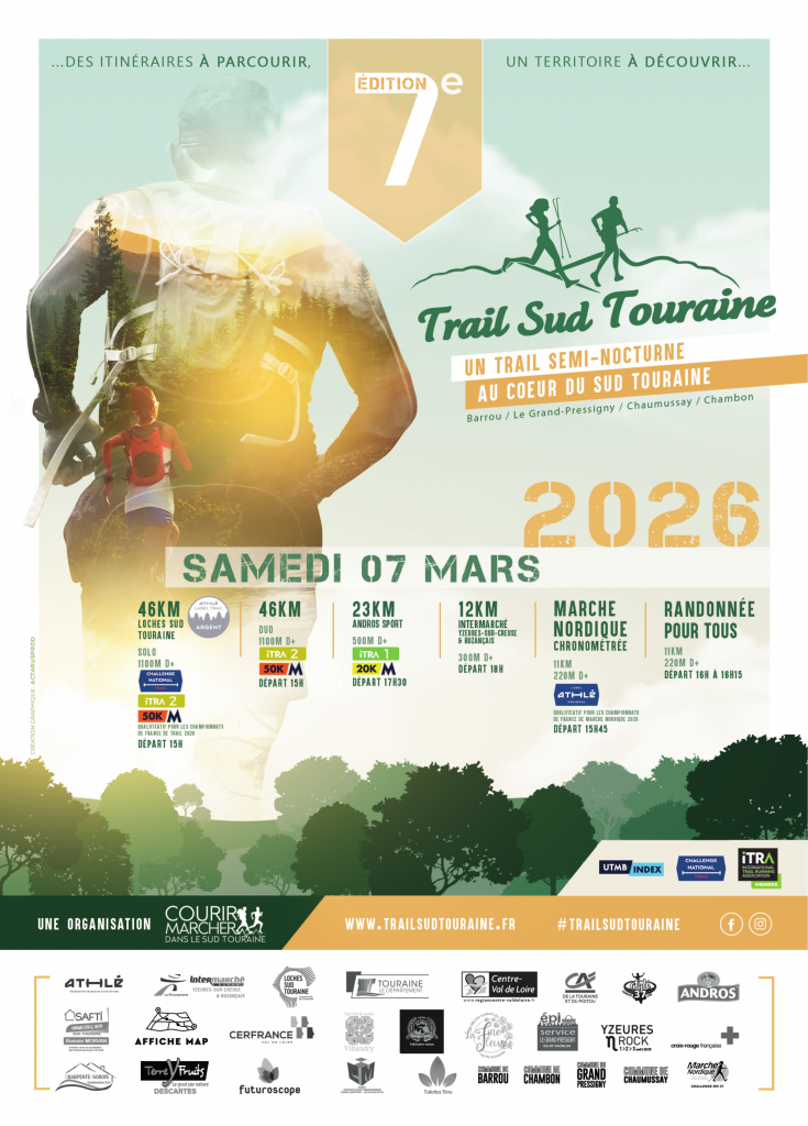 - 15 H 00 : départ du 46km Loches Sud Touraine en individuel (fait partie du calendrier du Challenge National Trail (longue distance) en 2026, Qualificatif pour les Championnats de France de Trails Courts 2026, Label National, 2 points ITRA et labélisée UTMB® Index dans la catégorie 50KM), dénivelé positif 1 100m.