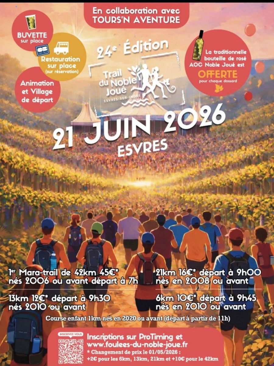 Nous sommes ravis de continuer l’aventure avec vous sur cette 24ème édition. Le TNJ ou Trail du Noble Joué vous fera découvrir ce beau terroir de l’AOC Touraine Noble Joué, entre vignoble, sous-bois et vallée de l’Indre. Le départ sera organisé au cœur des vignes, allée du Comte Odart à Esvres (suivre Ag2r La Mondiale).